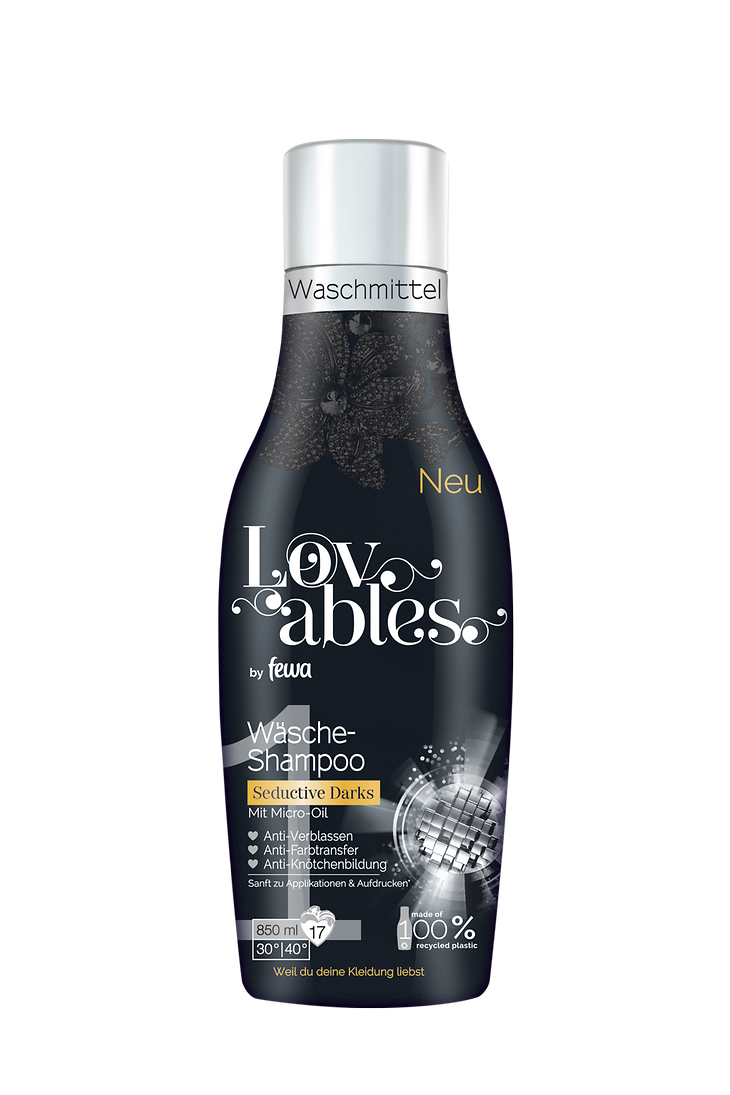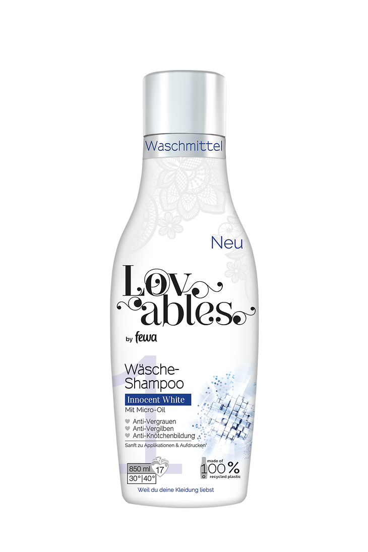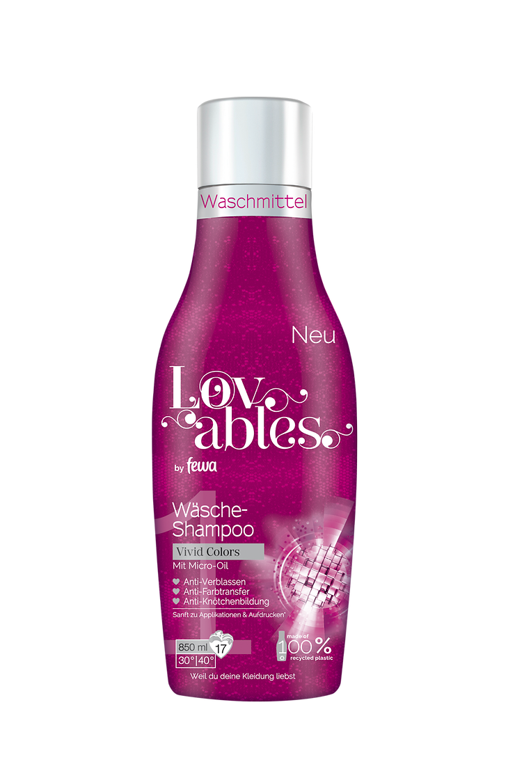 Ab Januar 2018 ist die Lovables Produktserie im Handel erhältlich. Wäsche-Shampoo (17 Anwendungen, 850 ml) und -Conditioner (34 Anwendungen, 850 ml) oder die praktischen Probier-Packungen von Shampoo und Conditioner zu 500 ml.