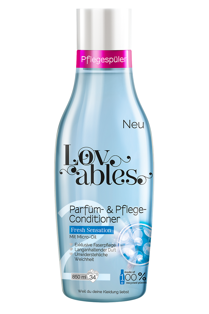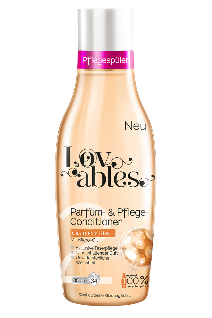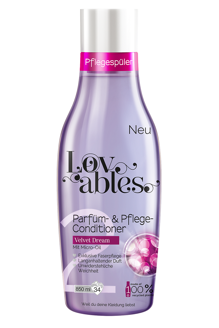 Die Lovables Parfüm- und Pflege-Conditioner bilden die perfekte Einheit aus exklusiver Faserpflege, langhaltendem Duft und unwiderstehlicher Weichheit. Die drei Weichspüler-Varianten Velvet Dream, Fresh Sensation und Cashmere Kiss sorgen für umwerfend weiche Kleidung, die man nie wieder ausziehen möchte. Die verführerischen Düfte unterstreichen zusätzlich den ganz individuellen Style ihrer Trägerin.