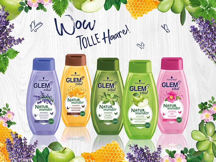 Glem vital Naturwunder geht mit den Sorten Honig Elixier, Olivenöl, Lavendel, Wildrose und Grüner Apfel auf die individuellen Pflegebedürfnisse der Haare ein. Die 10 Produkte umfassende Subrange sorgt so für natürlich schönes Haar - vom Ansatz bis in die Spitzen.