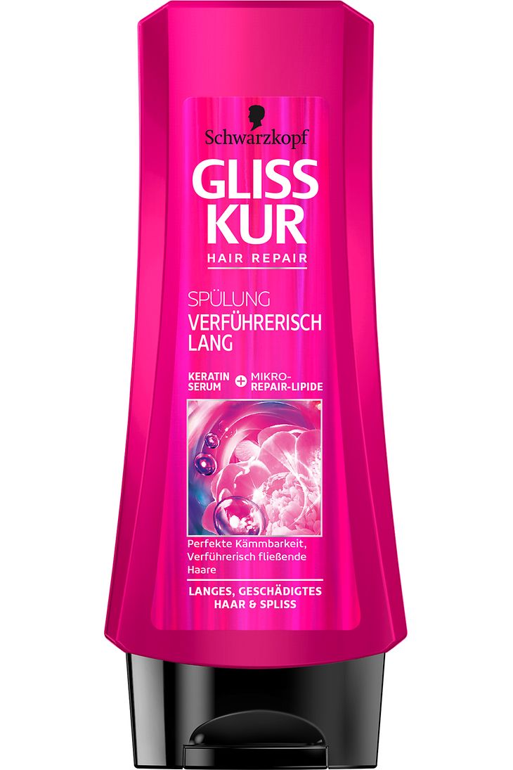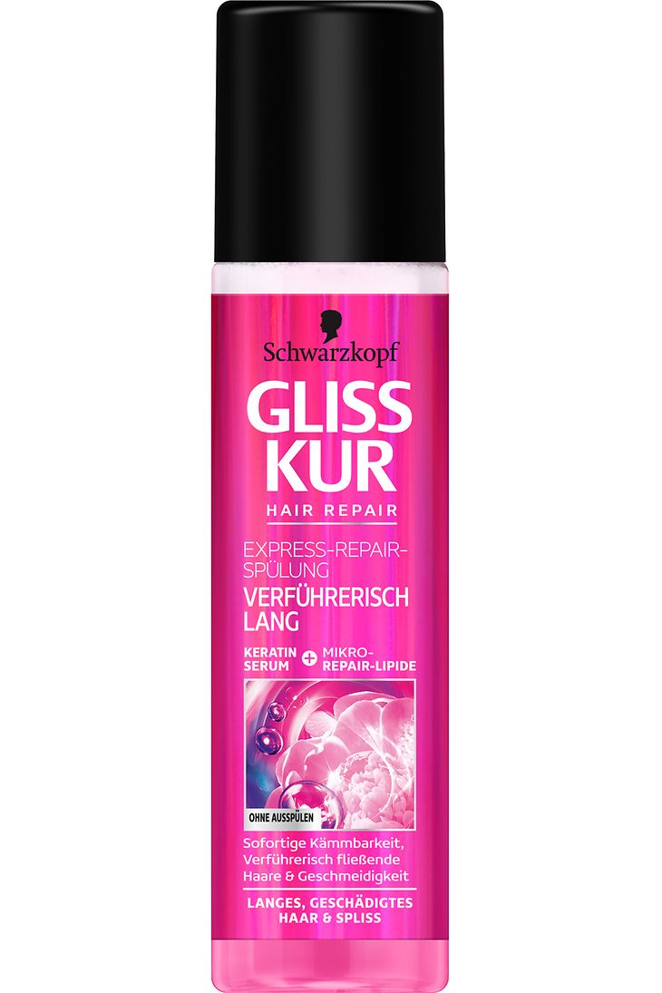 Vor allem bei geschädigtem Haar ist es sinnvoll, Shampoo, Spülung und Kur aus einer Pflegeserie zu verwenden, damit sie in ihrer Wirkungsweise optimal aufeinander abgestimmt sind. Neben dem Shampoo, das sanft überschüssiges Fett am Haaransatz entfernt, überzeugt Gliss Kur Verführerisch Lang mit der passenden Spülung, die als zusätzliche Pflege für perfekte Kämmbarkeit sorgt und Haarschäden repariert – für verführerisch fließendes Haar. Die Express-Repair-Spülung für sofortige Kämmbarkeit und Geschmeidigkeit wird auf handtuchtrockenes oder trockenes Haar gesprüht und im Anschluss nicht ausgespült – perfekt für alle, die Zeit sparen wollen und trotzdem keine Kompromisse in Sachen Haarpflege machen möchten.