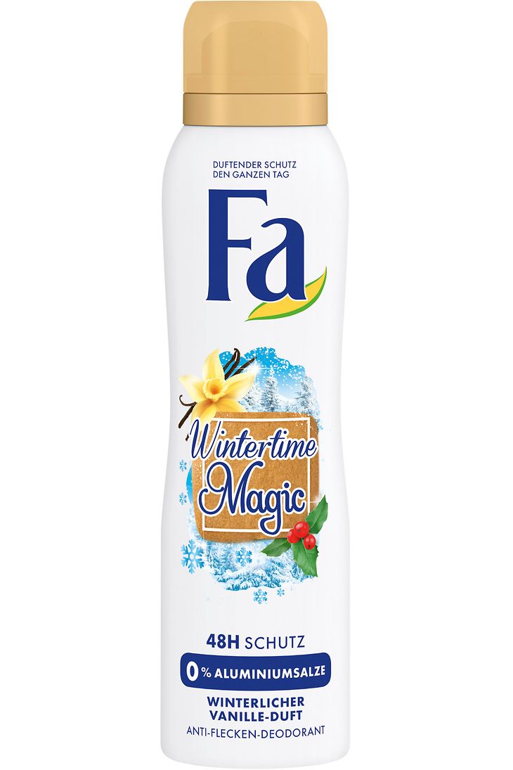 Auch das neue Fa Wintertime Magic Deodorant verwöhnt die Sinne mit einem herrlich winterlichen Vanille-Duft – ohne Aluminiumsalze. Der neue Aktiv-Frische-Komplex wirkt effektiv gegen Geruchsbildung und sorgt für einen zuverlässigen Schutz, ohne lästige Rückstände in der Kleidung. Das Fa Wintertime Magic Deodorant ist dermatologisch getestet und seine hautfreundliche Formel macht es für alle Hauttypen besonders verträglich – für winterliche Wohlfühlmomente!