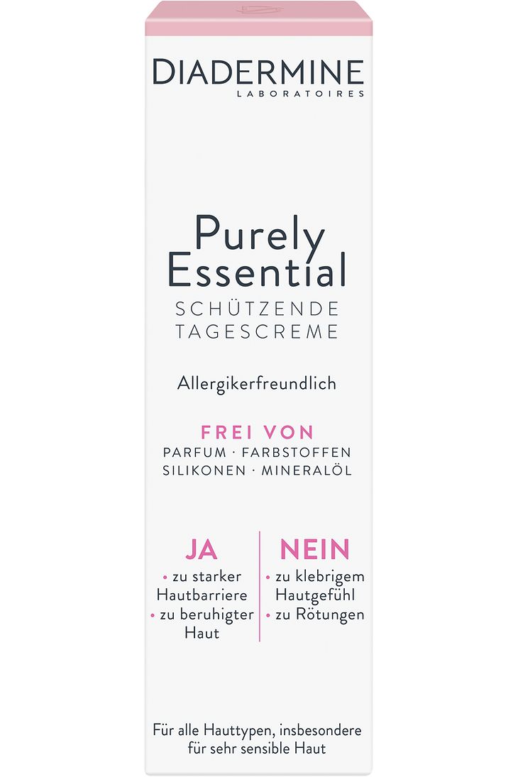 Ja zu einer starken Hautbarriere und beruhigter Haut! Nein zu einem klebrigen Hautgefühl, trockener Haut und Rötungen! Die neue Diadermine Purely Essential-Serie steht für die dermatologische Expertise von Diadermine und die Essenz einer hocheffektiven Gesichtspflege: Purely Essential verbindet hochwirksame Pflege mit einer sehr hohen Verträglichkeit. Sie ist für Frauen jeden Alters geeignet*, besonders sanft und schonend zur Haut und daher auch allergikerfreundlich.