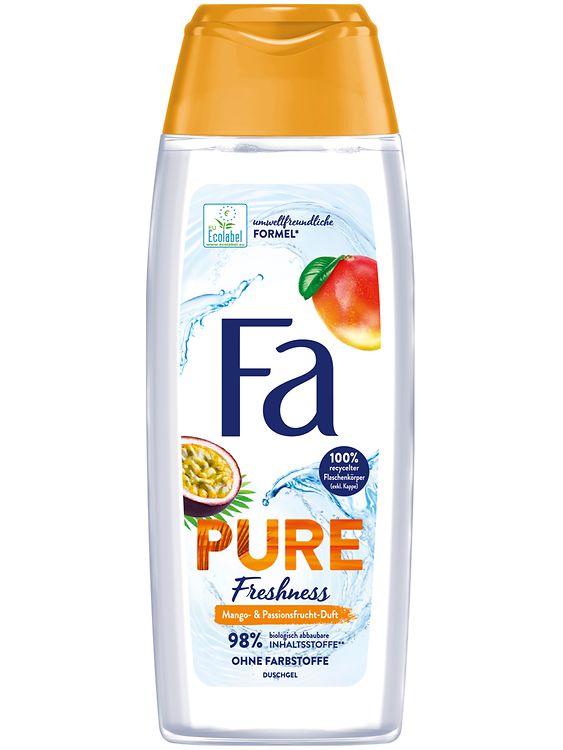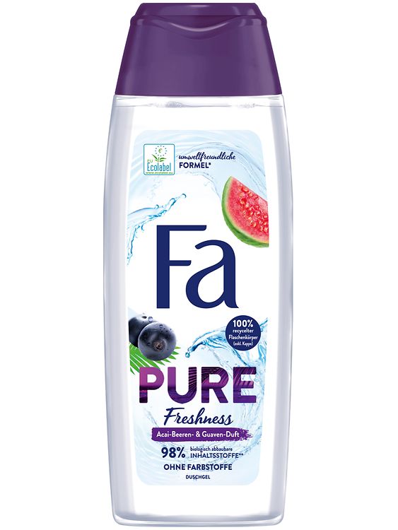 Das nachhaltigste Fa Duschgel, das es je gab: Die neue Fa PURE Freshness-Linie überzeugt ab sofort durch ihren exotisch-fruchtigen Duft und eine Extraportion Nachhaltigkeit. Die vegane* und umweltfreundliche Formel (ausgezeichnet mit dem EU-Ecolabel) der beiden Duschgele basiert zu 95 Prozent auf Inhaltsstoffen natürlichen Ursprungs**. Dabei besteht der transparente Flaschenkörper zu 100 Prozent aus recyceltem Plastik (exkl. Kappe) wovon 25% Social Plastic® sind. Zudem ist sowohl Flaschenkörper als auch Deckel recycelbar***. Die Sinne werden auf eine exotische Reise geschickt und man genießt den frisch-fruchtigen Duft von Acaibeere und Guave oder Mango und Passionsfrucht!