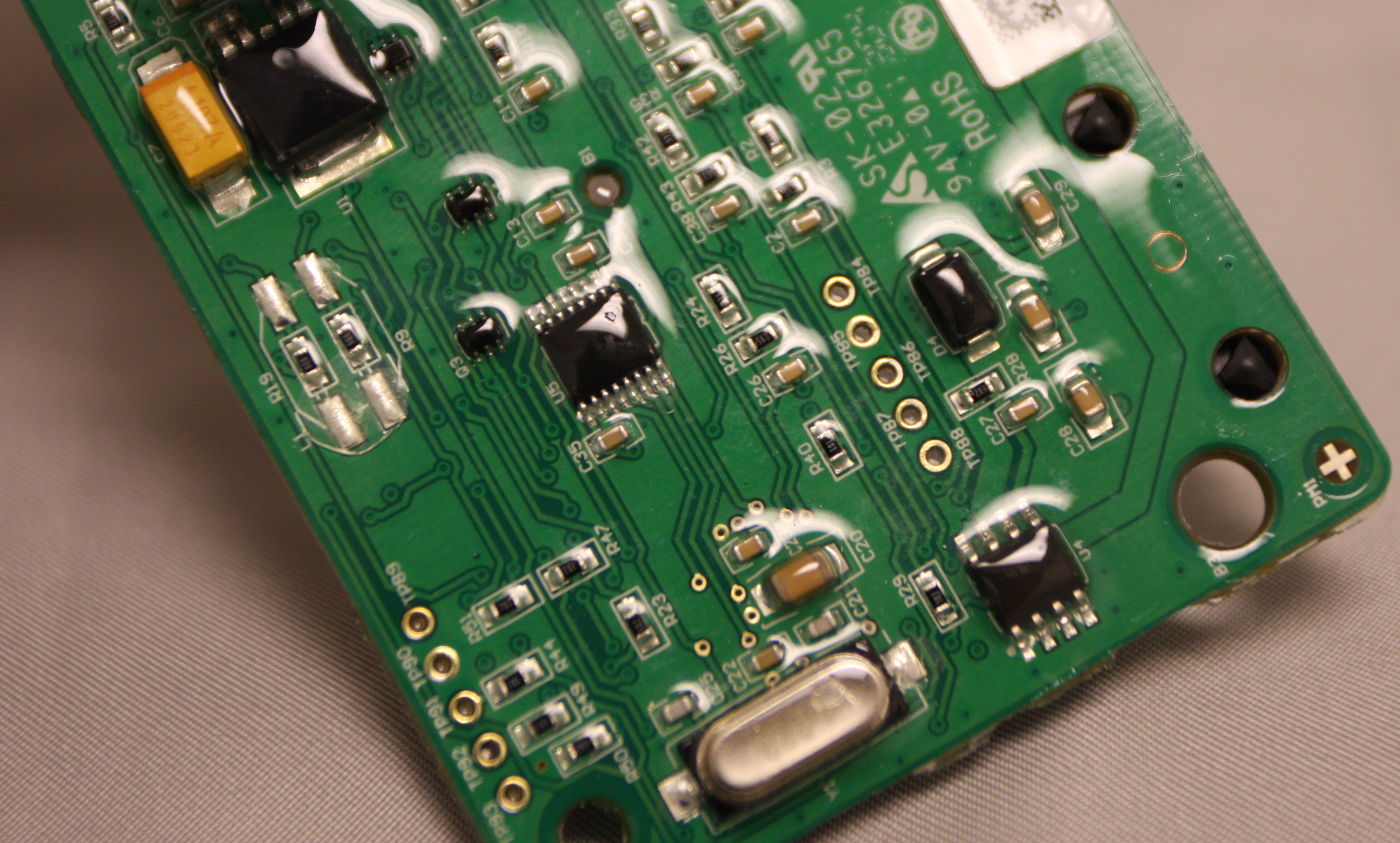 Bei Verarbeitung und Leistung setzt Loctite Stycast UV 7998 neue Maßstäbe: Das Material lässt sich leicht auftragen, bietet eine selbstnivellierende Verteilung über die gesamte Leiterplattenbaugruppe, ausgezeichnete Benetzung und eine gleichmäßige Beschichtung ohne Lufteinschlüsse. Die Aushärtung erfolgt innerhalb von Sekunden mit energieeffizientem UV-Licht, gefolgt von einer sekundären Feuchtigkeitsaushärtung. Danach ist die Leiterplatte zuverlässig gegen Umwelteinflüsse und Verunreinigungen geschützt.